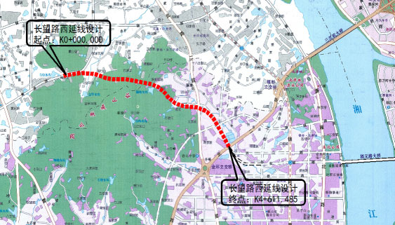 長望路西延線位于湘江新區(qū)范圍內(nèi),路線呈東西走向。道路西接黃金大道,往東沿谷山森林公園北側(cè)山體埡口,穿過龍湖湘風原著,往東接現(xiàn)狀金星北路,再向東南連接現(xiàn)狀西二環(huán),道路全長4.611KM,并對長望路(西二環(huán)-觀沙路)段進行了改擴建設(shè)計,長度0.611KM,金星路、黃金大道立交范圍內(nèi)的主線及輔道進行改造。本標段范圍為K0+000-K1+520。其中包括跨線一座、下穿式矩形框架橋一座、地下人行通道一座,線路設(shè)計為城市主干路、設(shè)計車速60km/h。